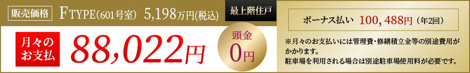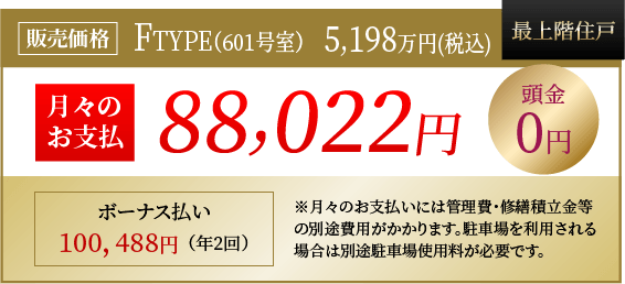 〈Ftype 601号室〉販売価格5198万円、元利均等50年返済、借入金5198万円、頭金0円、月々返済額(年12回)88,022円[元金5198万円]、ボーナス払い100,488円(年2回)