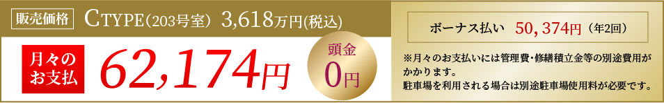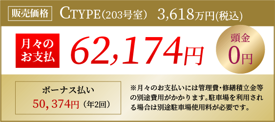 〈Ctype 203・303号室〉販売価格3618万円、元利均等50年返済、借入金3618万円、頭金0円、月々返済額(年12回)62,174円[元金3618万円]、ボーナス払い50,374円(年2回)