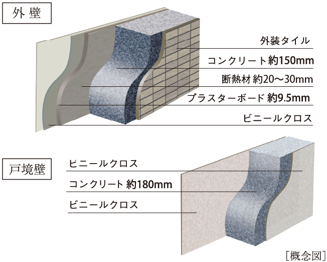 断熱処理を充分に施した外壁は約150mmの厚さを、暮らしのプライバシーを守る隣戸との戸境壁は約180mmの厚さをそれぞれ確保。静かで快適な住環境を実現します。