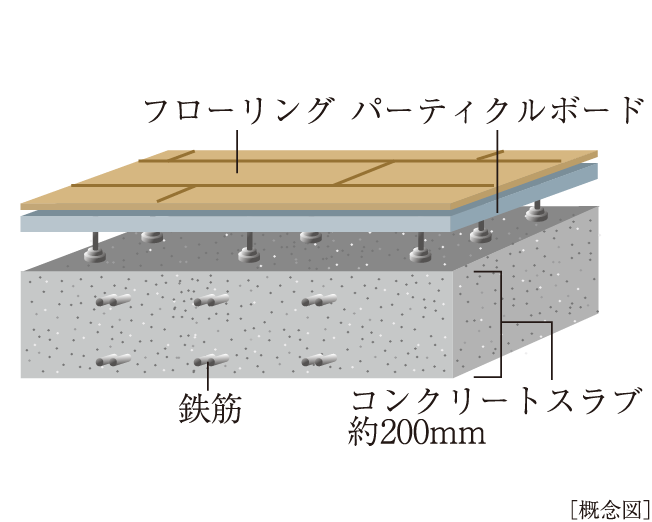遮音性を高めるためコンクリートスラブ厚約200mm。床は下階に生活音が伝わりにくく、リフォームやメンテナンスしやすい二重置床工法。床材はカタログ値の遮音等級がLL45及びLH50と優れた遮音性です。