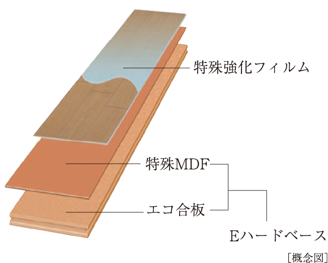 木の美しい風合いを活かしたフローリングは、キズや摩擦に強い高耐傷・高耐久タイプを採用。表面には汚れに強い特殊オレフィンシートを使用しています。