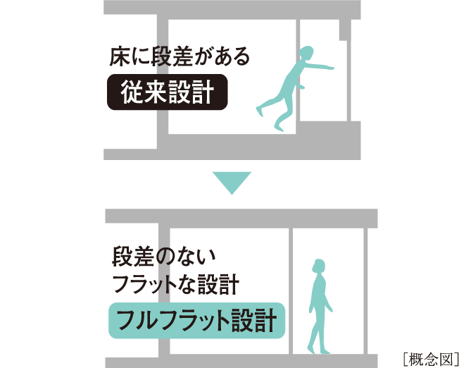 少しの段差でも、つまずいてしまったりと、思わぬ事故につながります。そんな危険を避けるために、水まわりも含めた住戸内の床段差をすべて解消した、フルフラット設計を採用。住まう人みんなにやさしいバリアフリー仕様です。
