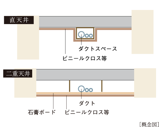 照明器具などの電気配線や配管変更が容易な二重天井は、メンテナンスやリフォームに好都合。優れた遮音性も特徴です。