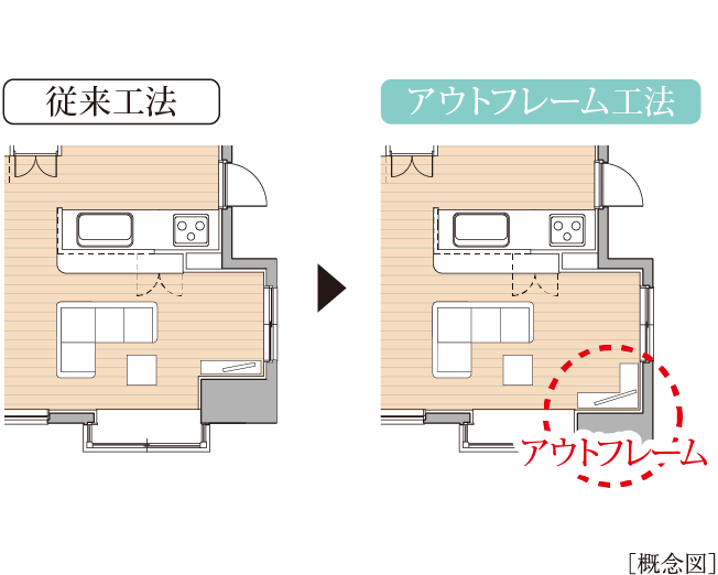 室内に張り出した柱を室外へ移動したアウトフレーム工法で、居室のコーナーがスッキリして室内を広く有効に使うことができます。